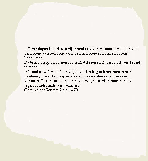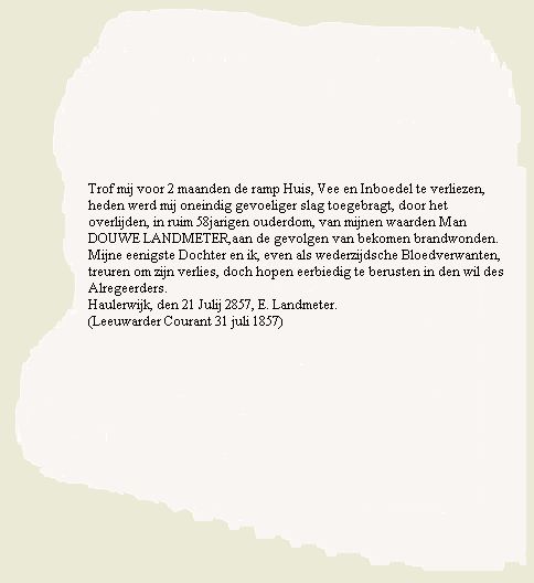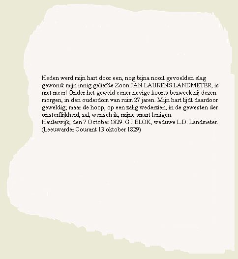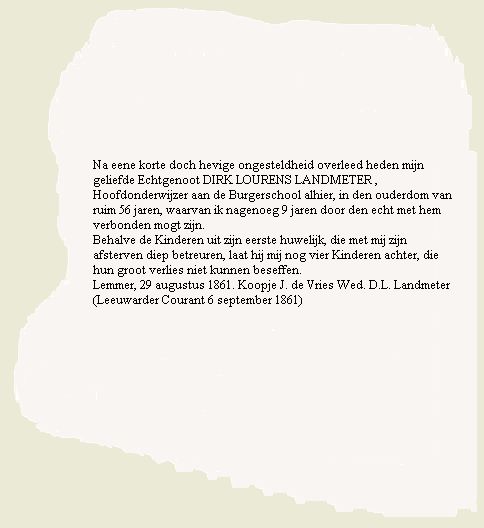 Afstammelingen van Dirk Lourens Koster: Jan Laurens Landmeter, zoon van Lourens Douwes en Grietje Jans Blok. Dirk Lourens Landmeter. En een krantenbericht en advertentie over Douwe Lourens Landmeter.
